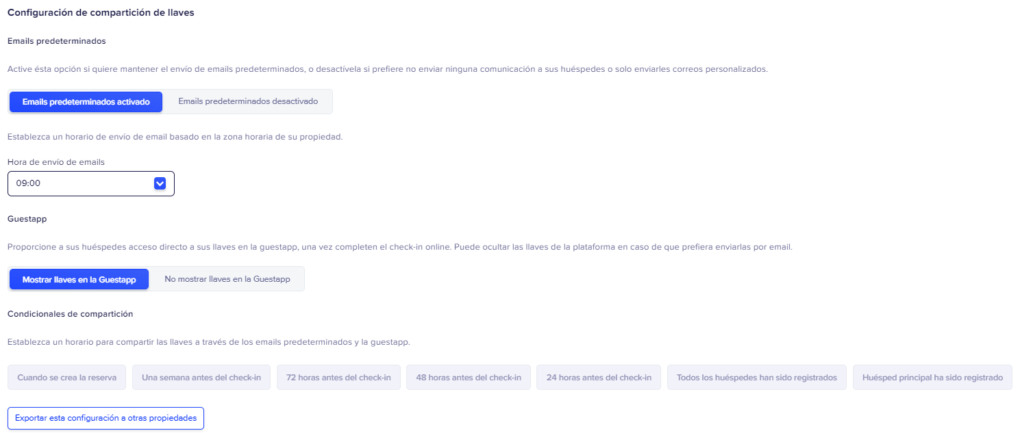 En ésta sección puedes configurar que los huéspedes reciban las llaves a través de email y/o la Guestapp. Recomendamos si o si dejar activado la opción de la Guestapp y si lo deseas, activar también la opción de email.