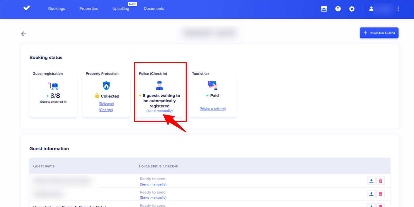 NOTA: Los datos de los huéspedes se envían automáticamente a las autoridades el día del check-in alrededor de las 19:00h UTC. Si los huéspedes se registran después de esta hora, deberás enviar los datos manualmente abriendo la reserva en Chekin y haciendo clic en ENVIAR MANUALMENTE: