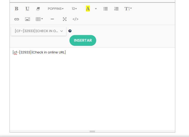 4. Seleccionamos el/los campos personalizados que queremos que se envíen y hacemos clic en el botón Insertar (esto debemos repetirlo con cada campo personalizado que queremos agregar en el cuerpo del email).