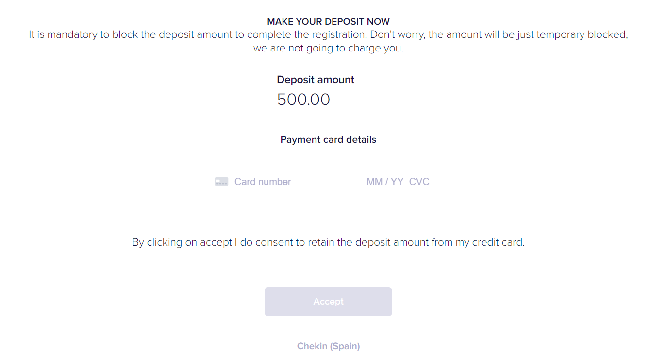 1 - Durante el check in online te pedimos que hagas el depósito añadiendo una tarjeta de crédito.