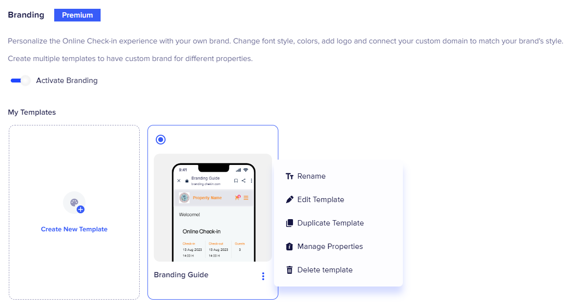 Una vez que hayas terminado de configurar la plantilla y la hayas guardado, podrás verla en la sección de plantillas, junto con cualquier otra plantilla que hayas creado. Allí podrás elegir una de esas plantillas para asignarla a una propiedad. También desde allí tienes acceso a un menú rápido con varios botones.