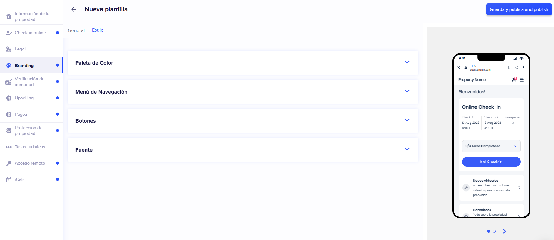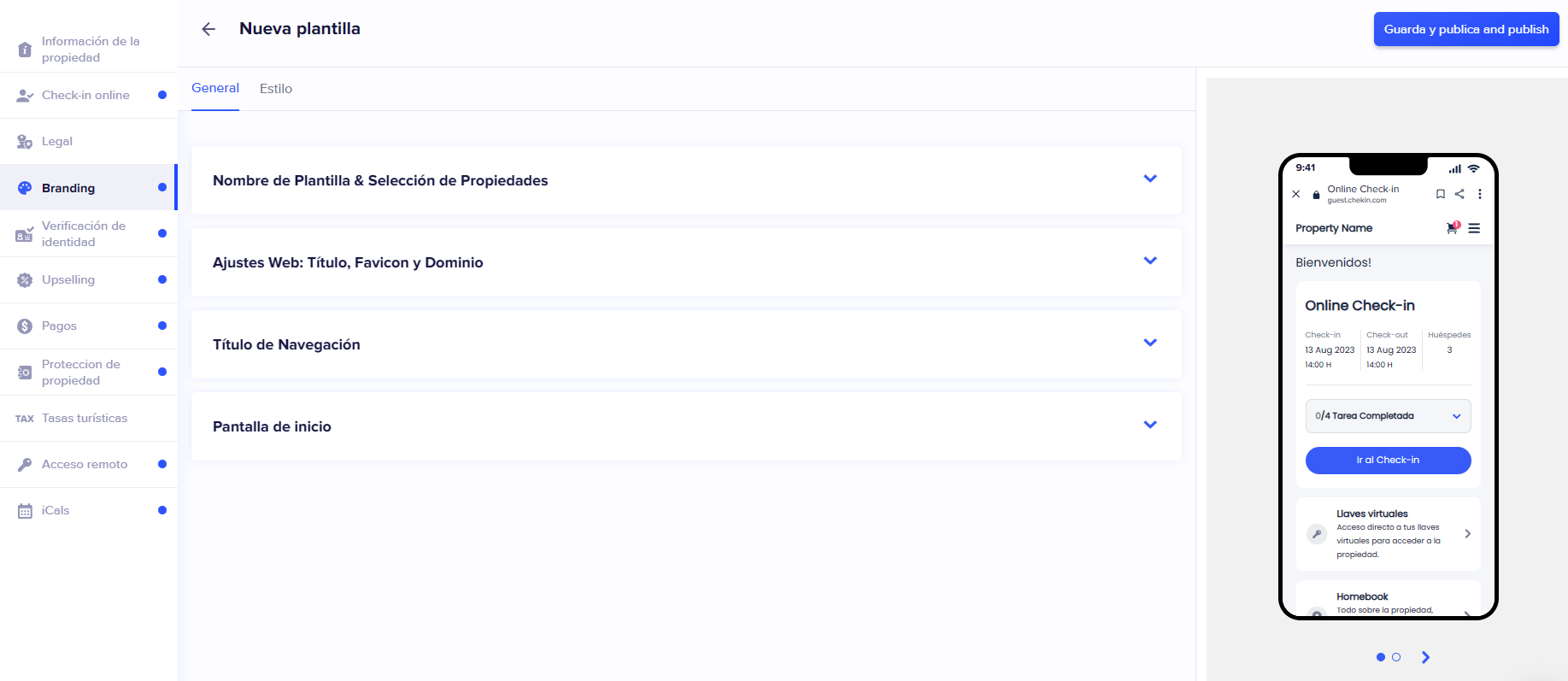 Para activar esta herramienta debes acceder al panel de control de Chekin y buscar la sección "propiedades". Una vez allí, haz clic en una de tus propiedades y accede a la herramienta "Branding".