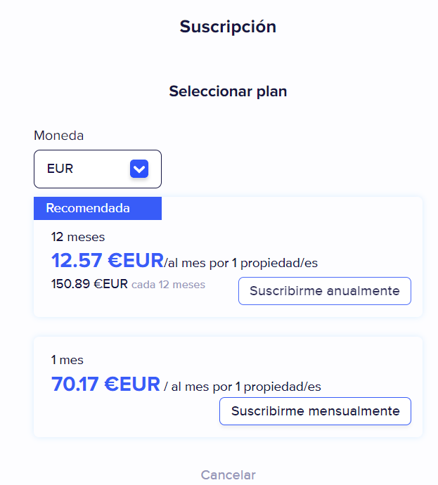 Desde aquí puedes cancelar tu plan actual en el caso de que hayas decidido dejar de utilizar nuestro software (ya sea por motivos de cese de actividad profesional, venta de propiedades, descontento con el software, precio, etc.).