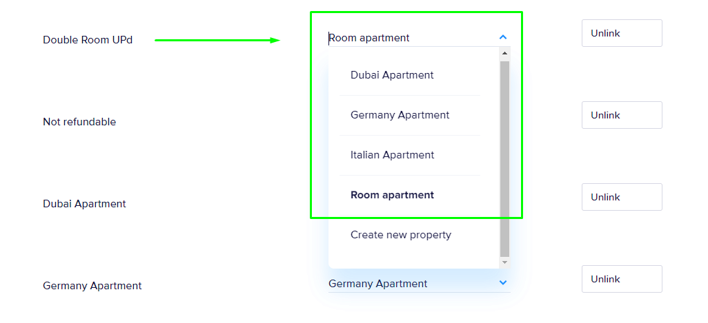 Si desea asignar una habitación a una propiedad que ya ha creado, haga clic en el menú desplegable y seleccione una de las opciones. Haga clic en "Desvincular" si no asignó la unidad a la propiedad correcta al principio.