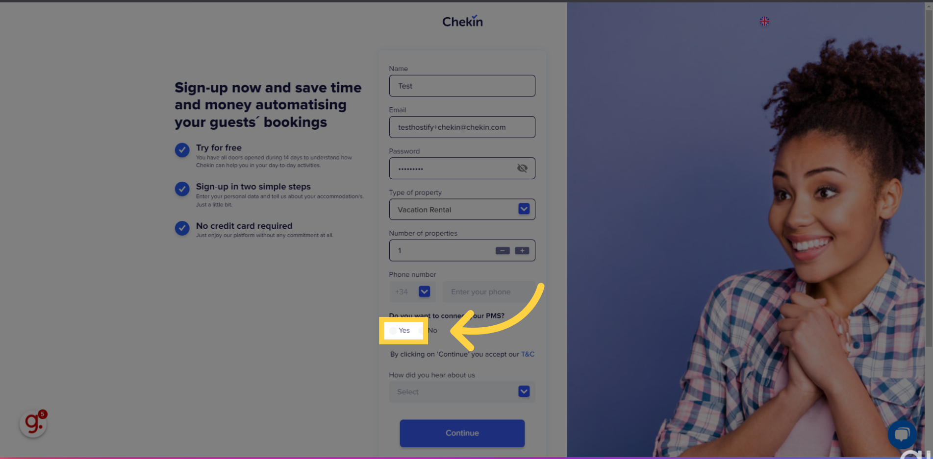 2. Selecciona "Sí" para conectar un PMS