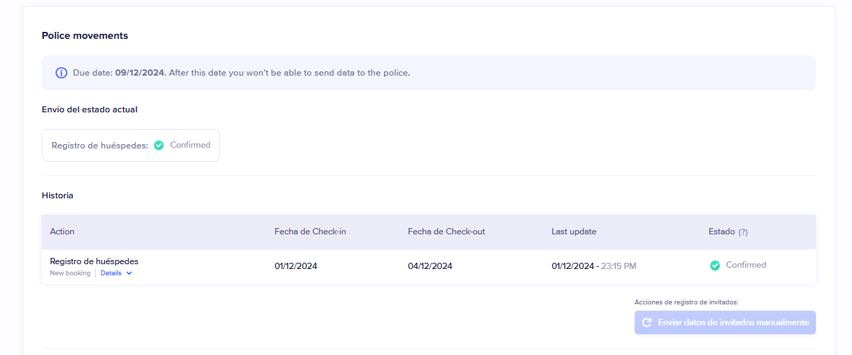 Los datos se envian a las 20.00h el día de entrada. Si los huéspedes se registran después de esa hora, debes enviar la reserva manualmente desde el botón ´enviar manualmente´ que se encuentra en la reserva en Chekin, en la sección ´police movements´.