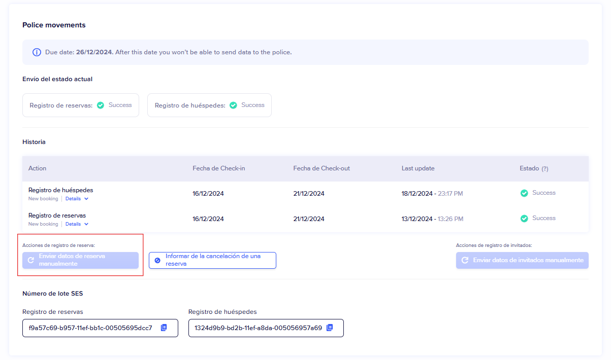 El envío a SES Hospedajes se diferencia del envío a la Policía Nacional/Guardia Civil porque ya no verás directamente el estatus de "enviado".