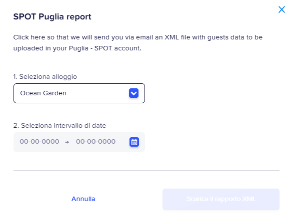 Invieremo al tuo indirizzo e-mail un report per l'ISTAT in formato XML che raccoglierá i dati per le date precedentemente selezionate.
