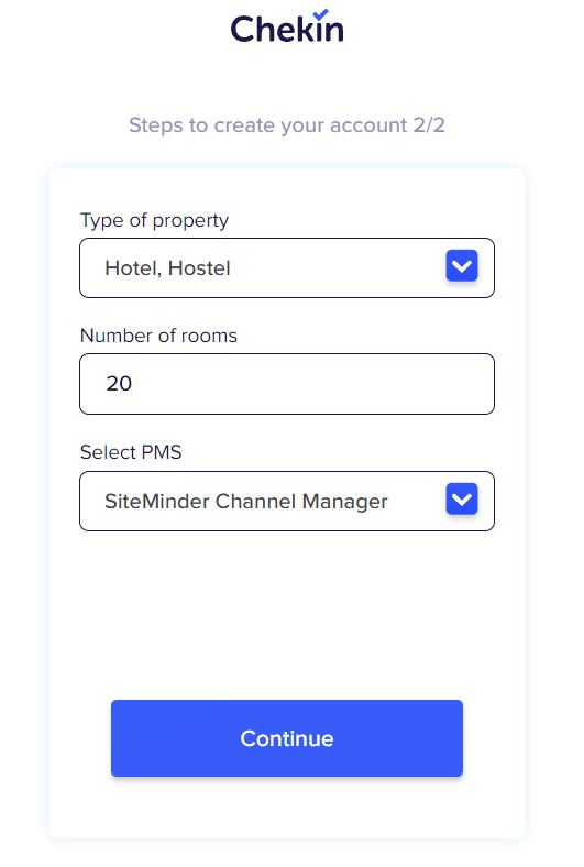 2 - Inserisci le informazioni richieste sulla tua proprietá e seleziona il tuo PMS, poi clicca su Continua: