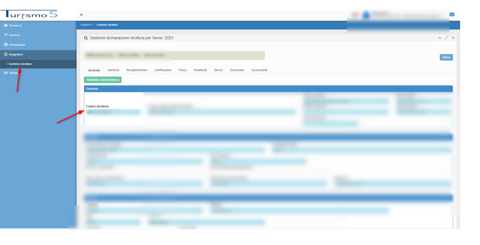 3- Assicurati di aver inserito correttamente il codice della struttura nella sezione "Codice Struttura" di Chekin. Puoi trovare questo codice nella sezione Anagrafica > Gestione Strutture del tuo account ISTAT.