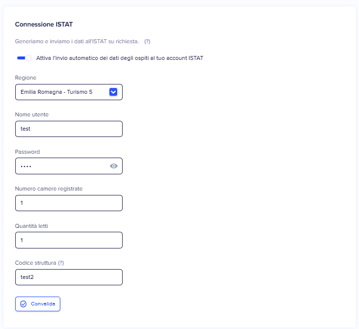 Se non funziona, si consiglia di contattare [email protected] di GIES, la piattaforma di istat, comunicando che si desidera inviare i dati da Chekin a istat tramite servizio web e si ha bisogno di un nome utente e di una password.