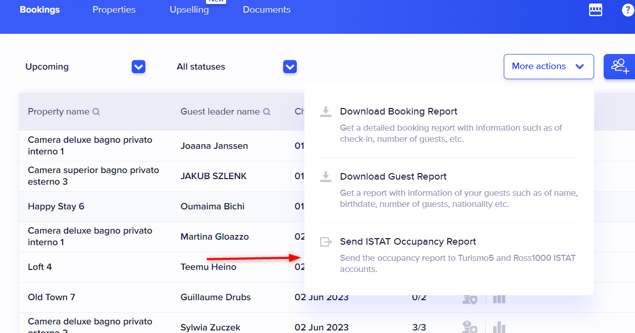 Per fare ciò, devi recarti nella scheda delle prenotazioni e nel riquadro "Altre azioni" fare clic su "Invia rapporto di occupazione ISTAT", selezionando le date dal primo all'ultimo del mese per assicurarti che tutte le parti non correttamente visualizzate vengano corrette.