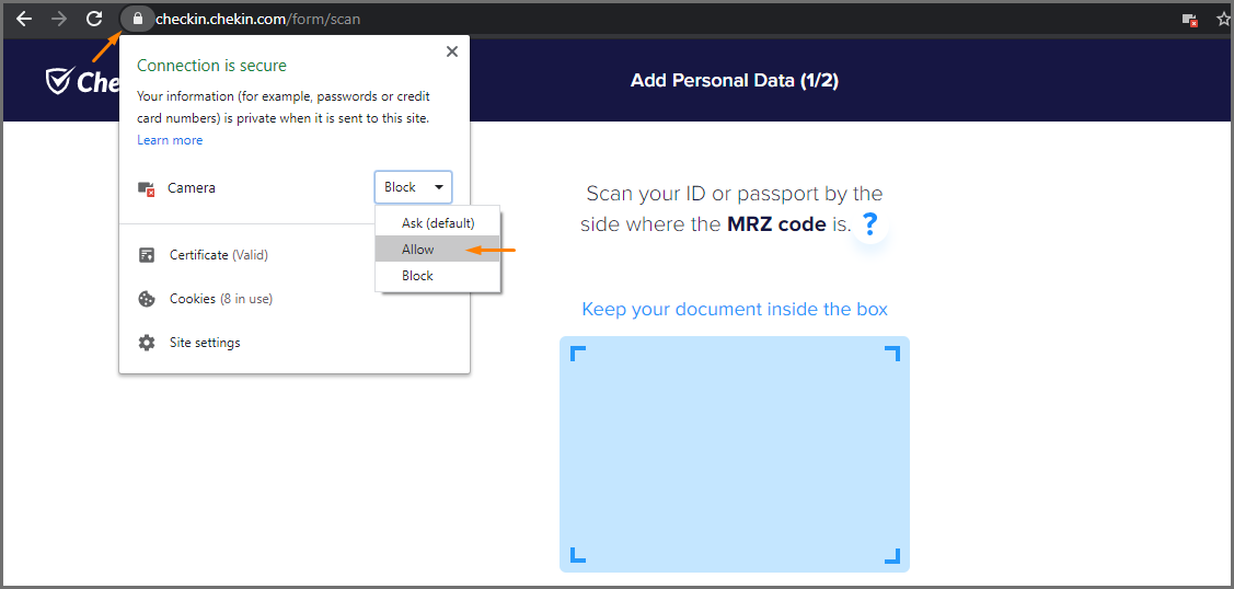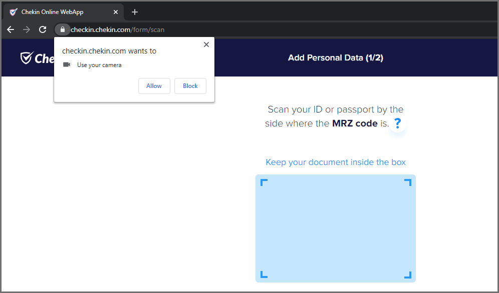 Updated over 2 years agoIf you are using the scanner feature on any of Chekin services for the first time on a Chrome browser, you need to allow the access of the camera.