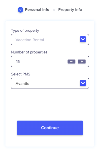 2 - Complete the property info required and select Avantio in the list of PMS. Click Continue.