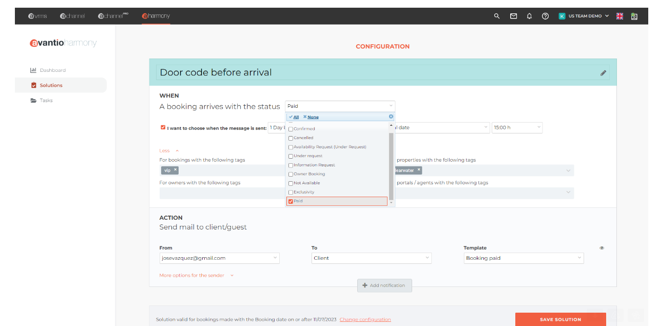How to set the codes sending from your Avantio messagging hub? You have to use Harmony, where you can set conditions of codes sending: