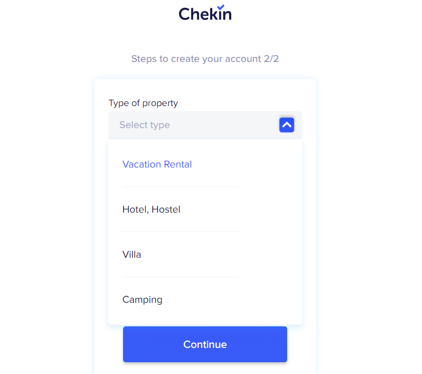 1 - Create your Chekin account by filling the info requested in the following form, click CONTINUE.