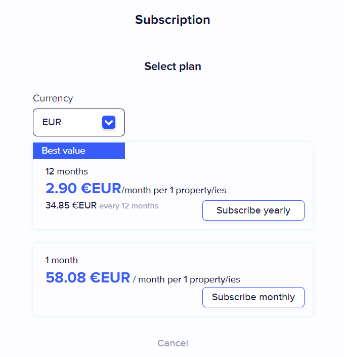 Next, you must go to your "billing" section. Here you can find a panel with basic information about you subscription tittled "current plan". This panel includes data about the plan you have choosen (hotel or housings), the number of properties or rooms you have and the type of subscription you have contrated (monthly or yearly).