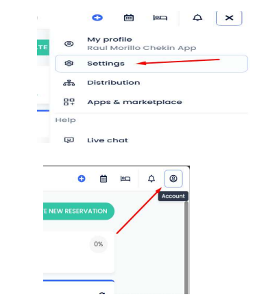 Log in to your Cloudbeds account and tn the top right corner click on Account, then Settings.