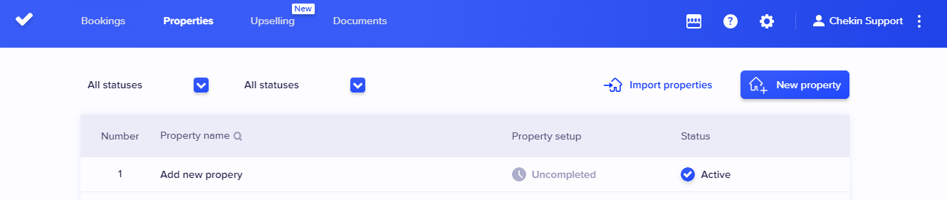 First of all the properties you have in Cloudbeds will be synced to your Chekin account, you will be able to see them in the "properties" section. When they are synced, you will need to add the property details and activate the tools you are going to use.
