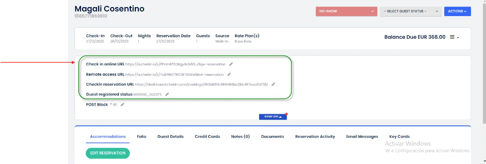 Chekin sends the check-in online url, Remote Access URL, Reservation URL, and the Guest registered status. You can see this under each reservation: