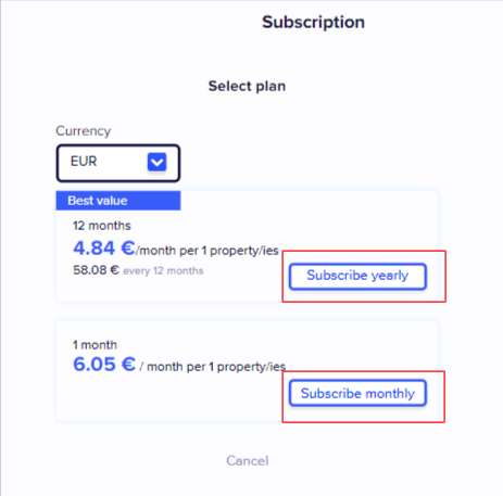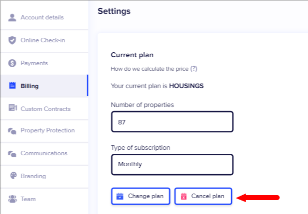 Once you have an active subscription and a valid payment method, your subscription will automatically renew at the end of the period. You can change between monthly and yearly subscription whenever you want, and any changes in the number of active rooms or properties will automatically update your subscription, so Chekin will charge you only for the active properties or rooms during the corresponding period. In the Billing section you can also check past invoices.