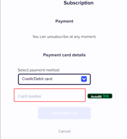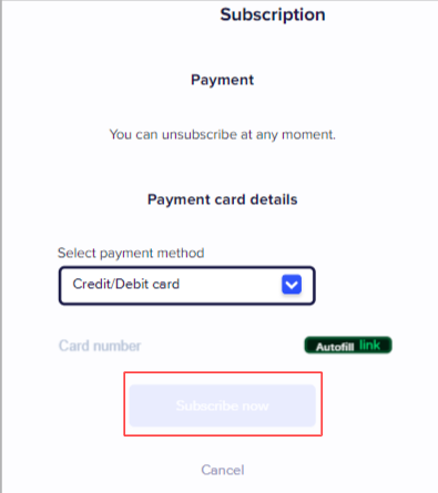 When the trial ends, you need to complete your subscription to continue using the service. You can do this by clicking on ´Subscribe now´ at the top of the dashboard and following steps 1-6 below.