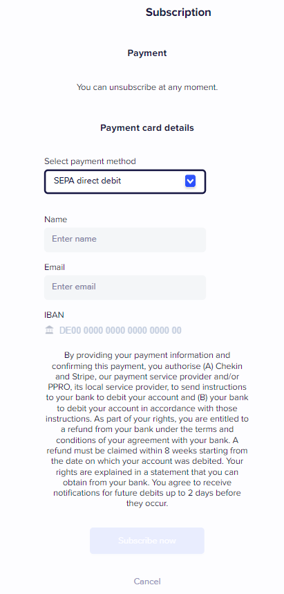 4. If you chose SEPA/Direct debit, you will need to fill out the following details: