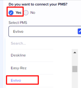 8 - Do you want to connect your PMS? Choose ´Yes´ and then choose Eviivo from the dropdown menu that appears