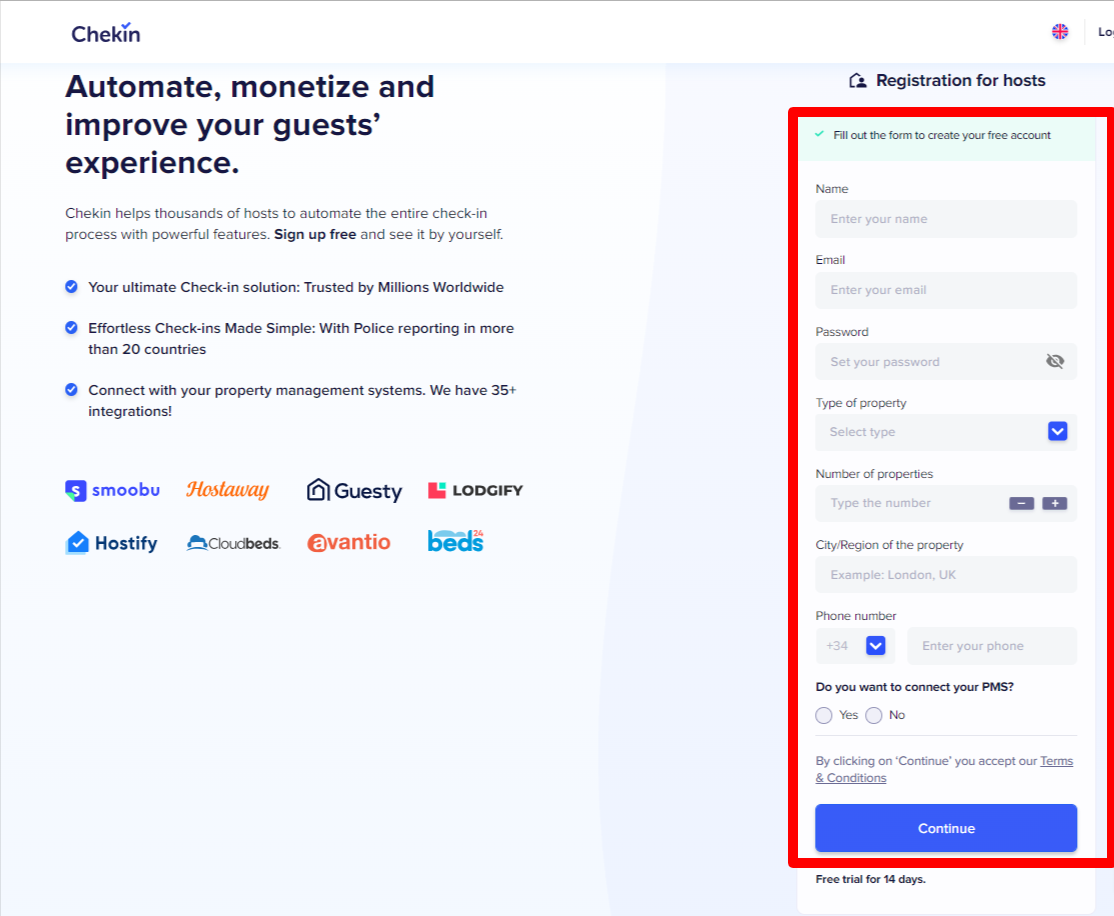 Once you connect to Chekin you have a trial period of 2 weeks where you can register all the guests you receive in your accommodations.
