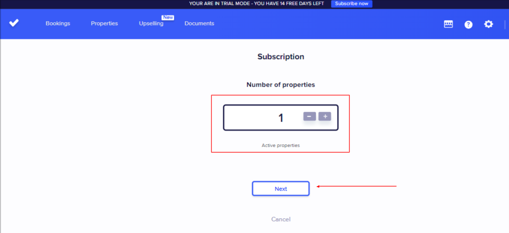 Select the number of rooms or properties (for vacation rentals) of your subscription. The minimum charge for a hotel plan is 20 rooms;