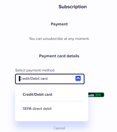 3. Choose the payment metod: Direct debit or credit card and add the payment details.