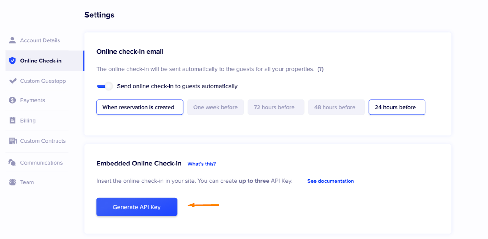 You can automatically generate an API key from the Chekin dashboard. To start go to the account settings and select the Online check-in in the lateral menu.