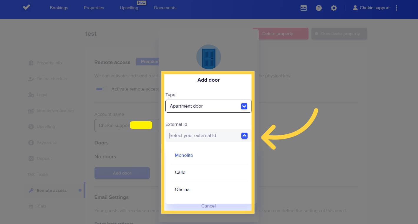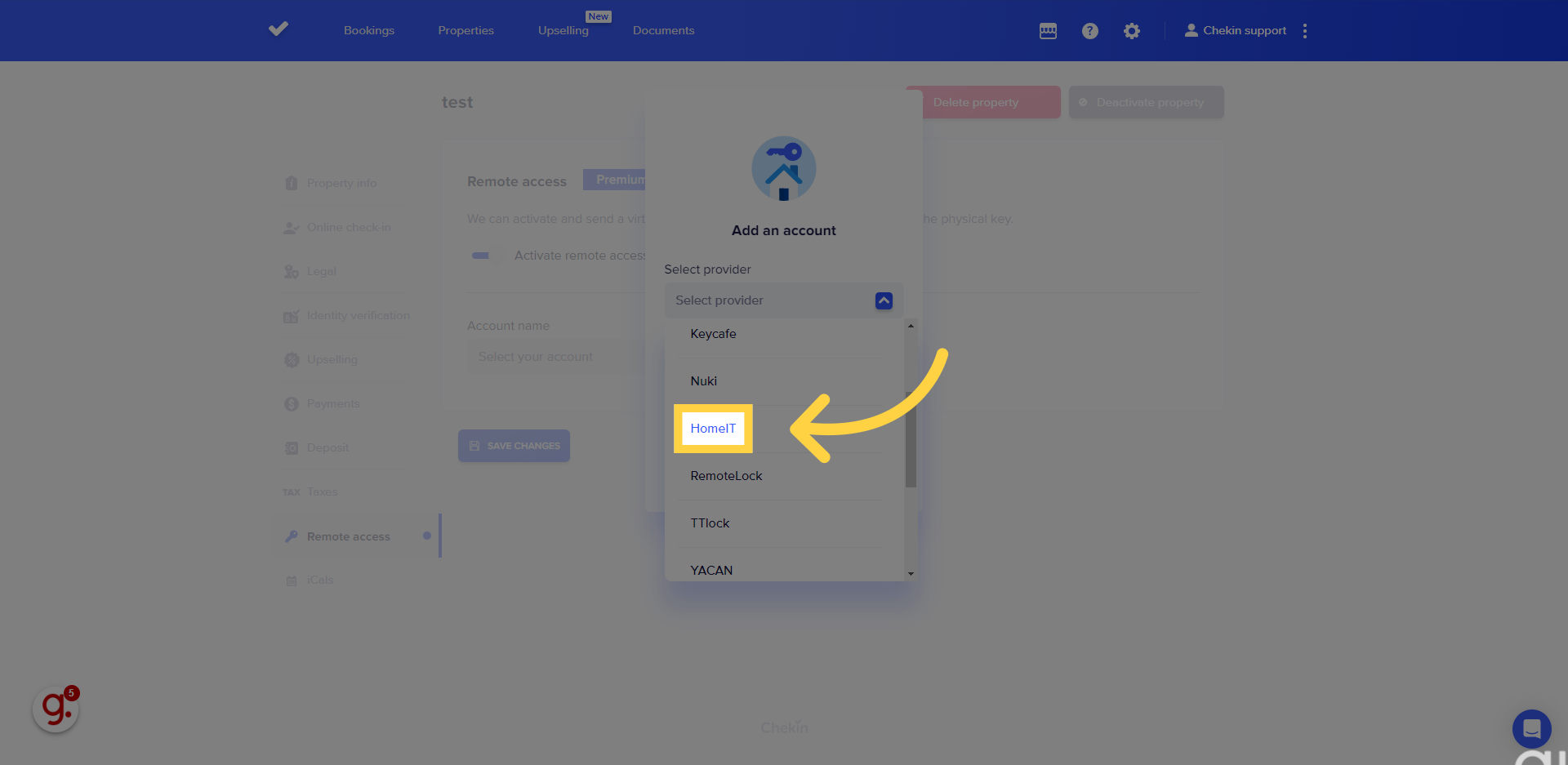 You can connect your Chekin account with HomeIT in the Remote Access tab of your property