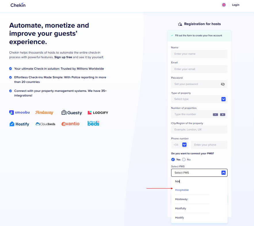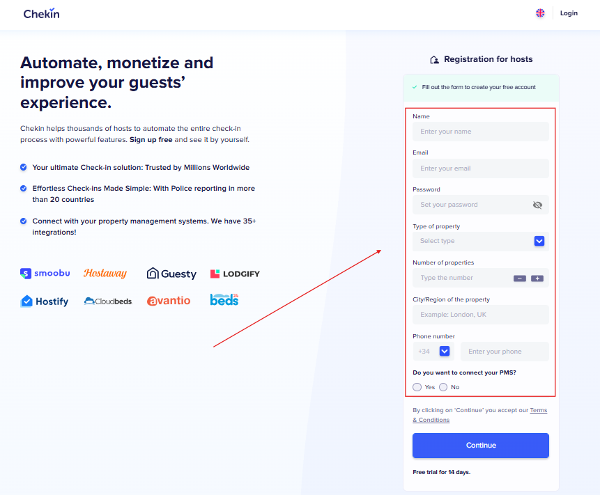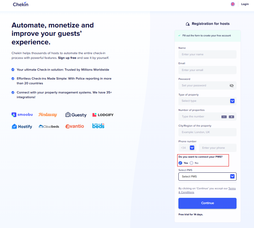 Note: If you already have a Chekin account without the integration, please contact us via chat or by sending an email to [email protected] for further assistance.