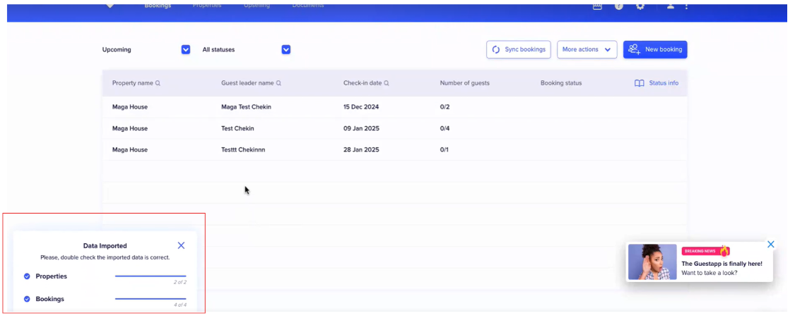 10. After a few minutes, you will be redirected to the Chekin dashboard, where you can verify that the properties and bookings are being imported.