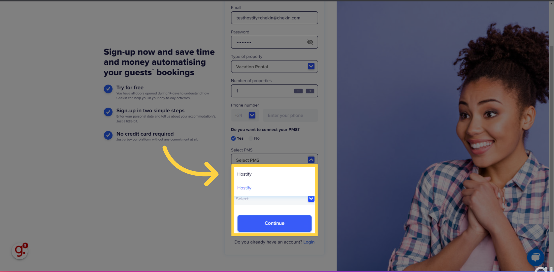 Note: If you already have a Chekin account without the integration, please contact us using the chat or sending an email to [email protected] for further assistance.