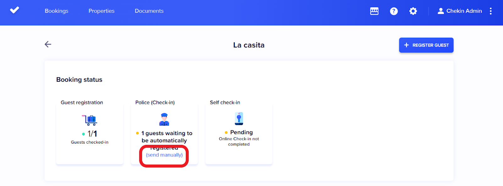 You have to generate a entry form for each guest you receive and then send it to the authorities' website. The form must be sent on the day of the check-in date of the booking or up to 24 hours later. Once this form has been uploaded, it must also be registered in the guest book with the corresponding numbering. In order to carry out this process through Chekin, you must follow the following steps: