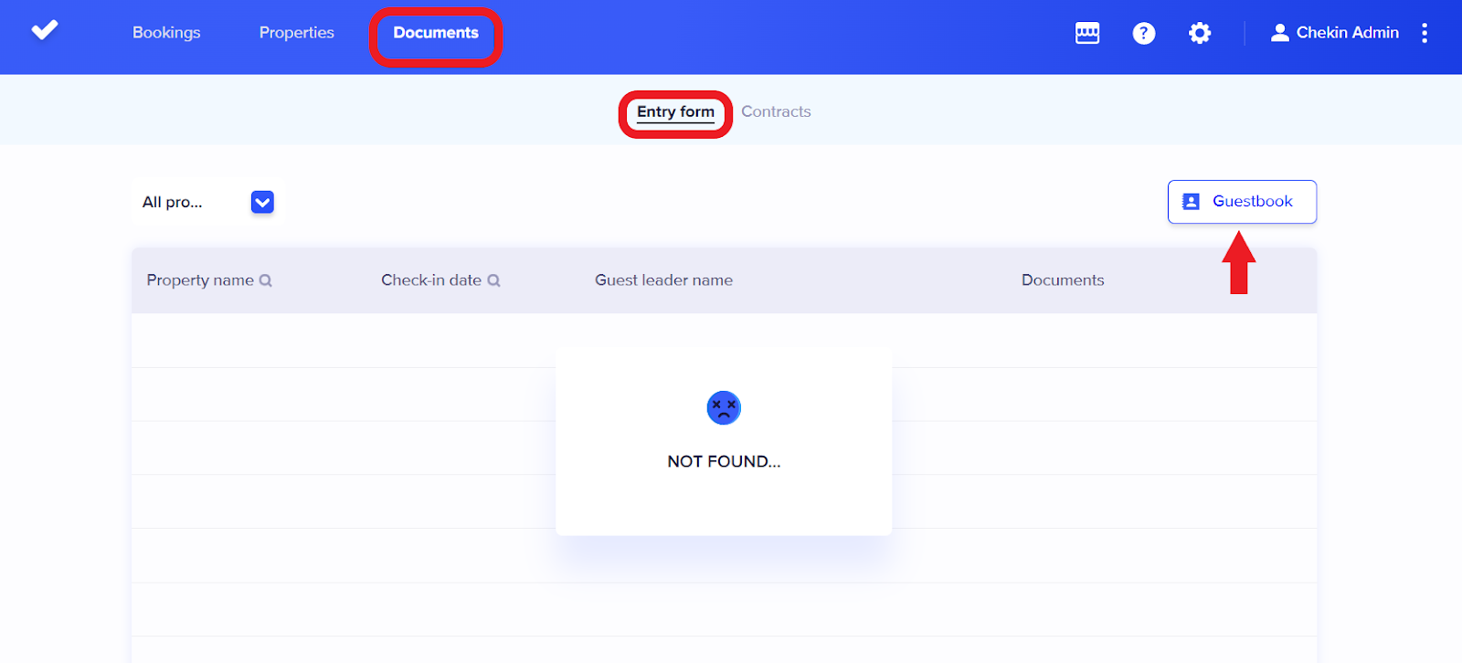 The "entry forms" section includes the traveller reports generated for all your guests sorted by booking. You also have the option to filter by property to see the reports generated for each specific property.