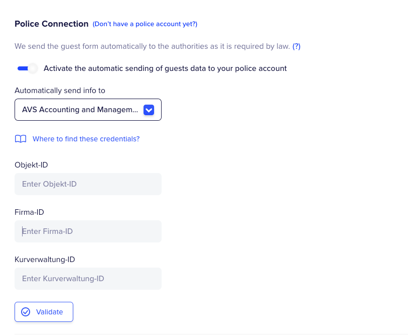 Updated over 2 weeks agoIn this article we explain how to activate the police connection in your Chekin account and connect to AVS to register your guests.