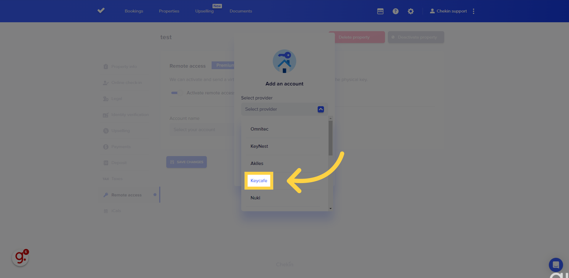 You can connect your Chekin account with KeyCafe in the Remote Access tab of your property