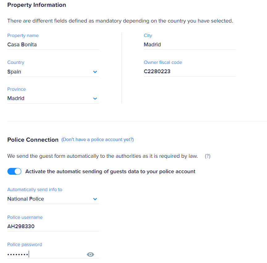 Add the property information, useful to generate the guests registration form with all the info required by law. Then add also the credentials of your police account: