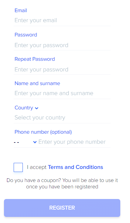 4 - Create your Chekin account by filling the info requested in the following form, click on "I accept Terms and Conditions" and then on REGISTER