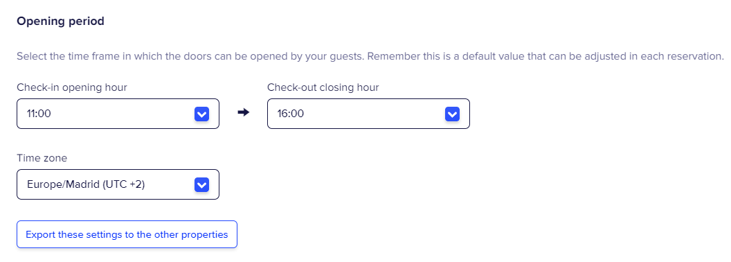 You can decide when your keys will be working for your guests, configuring check-in/checkout opening hours.