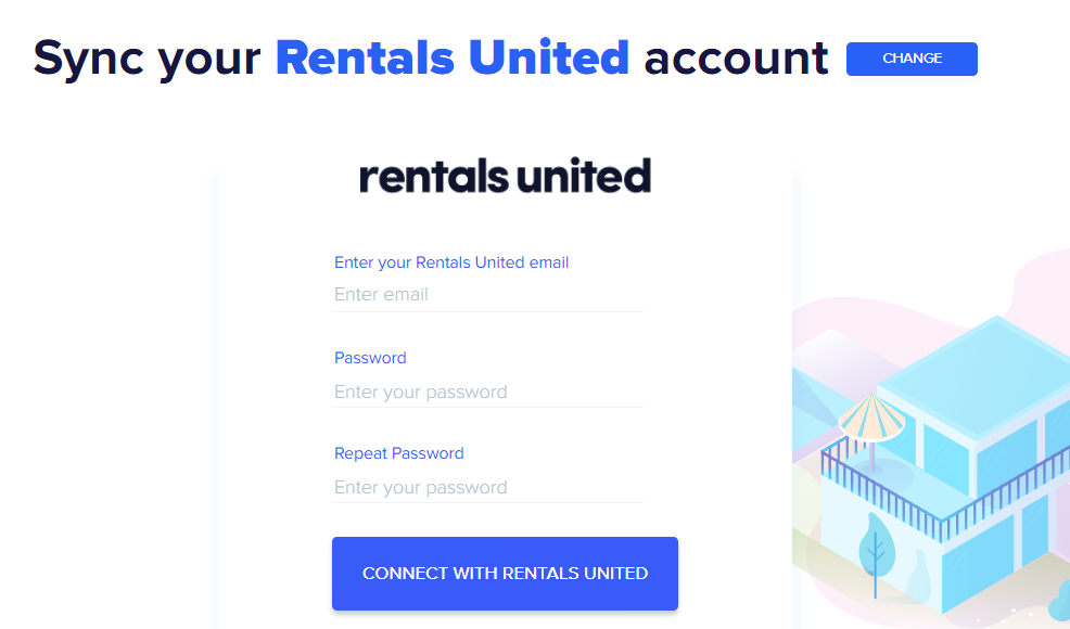 6 - Insert the email address of your Rentals United account, choose the email and the password you would like to have in your Chekin account and then click on “CONNECT WITH RENTALS UNITED”