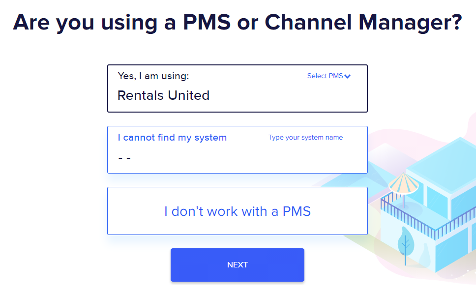 5 - You will be asked if you use any PMS or Channel Manager, select Rentals United and click on NEXT:
