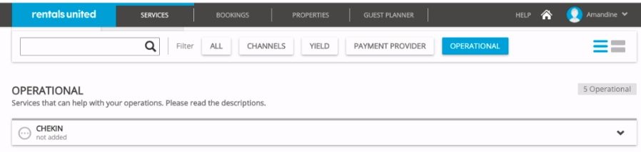 1 - Access your Rentals United account and click on SERVICES, then on FIND SERVICES and finally in OPERATIONAL. You'll find Chekin between all the options available: