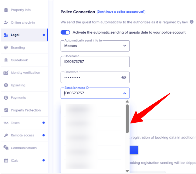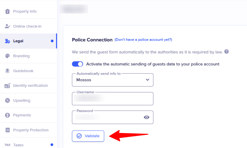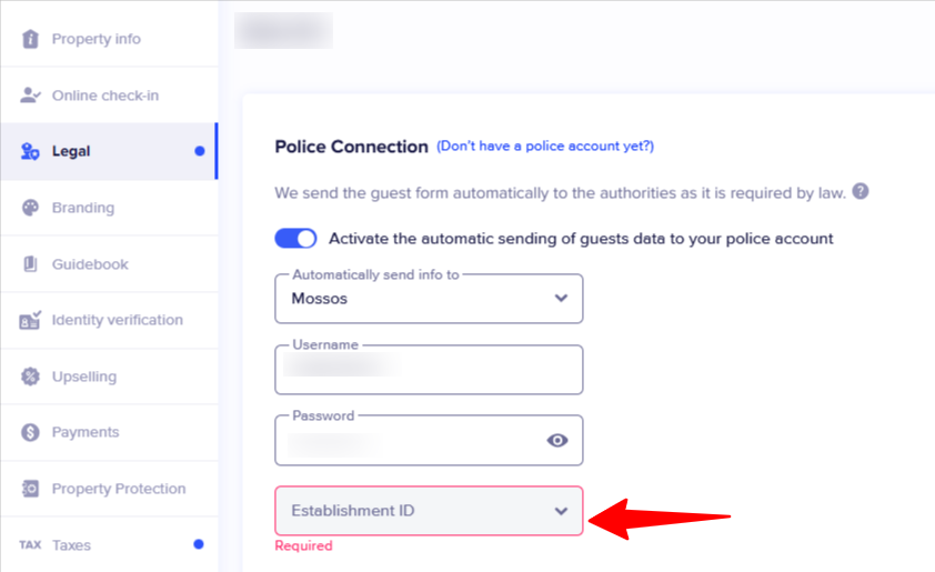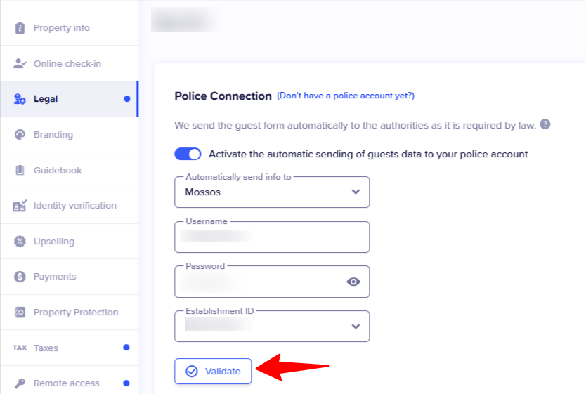 NOTE: If your reservations are returning an error, it is likely that the establishment number has not been added in the LEGAL section. To resolve this, click on VALIDATE, which will display the Establishment ID field. Then, select the ID from the dropdown menu and click VALIDATE again.